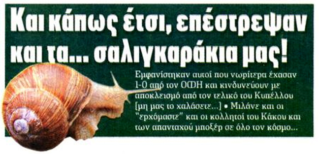 Η εφημερίδα «ΓΑΥΡΟΣ» πάντως ήταν προετοιμασμένη για την αναμενόμενη καζούρα και είχε έτοιμη την απάντηση: «Και κάπως έτσι επέστρεψαν και τα… σαλιγκαράκια μας. Εμφανίστηκαν αυτοί που νωρίτερα έχασαν από τον ΟΦΗ και κινδυνεύουν με αποκλεισμό από τον τελικό του Κυπέλλου (μη μας το χαλάσετε). Μιλάνε και οι “ερχόμαστε” και οι κολλητοί του Κάκου και των απανταχού μποξέρ σε όλο τον κόσμο…»