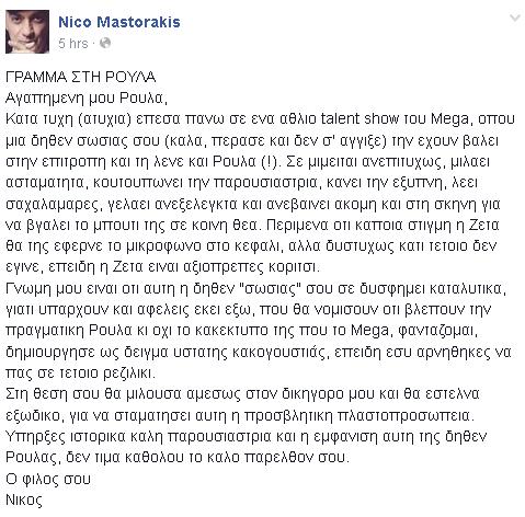Με μια ανάρτησή του στο Facebook, ο Νίκος Μαστοράκης, με τον καυστικό τρόπο που τον χαρακτηρίζει, ασκεί κριτική στη Ρούλα Κορομηλά για την εμφάνισή της στο talent show του Mega, Just the Two of Us.