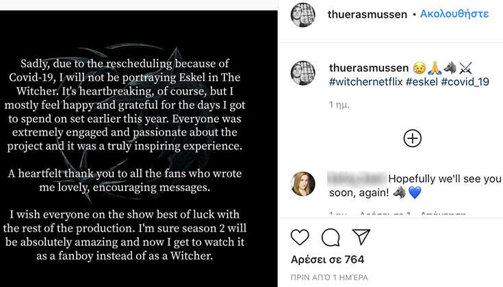 Χαρακτηρίστηκα αναφέρει: «Δυστυχώς, λόγω των αλλαγών στο πρόγραμμα λόγω Covid-19, δεν θα ενσαρκώσω τον Eskel στο «The Witcher. Είναι λυπηρό, φυσικά, αλλά κατά κύριο λόγο είμαι ευγνώμων για τις μέρες που πέρασα στο πλατό στις αρχές του χρόνου. Όλοι ήταν πολύ δοσμένοι και παθιασμένοι με το project και ήταν μια εμπειρία που πραγματικά με ενέπνευσε».