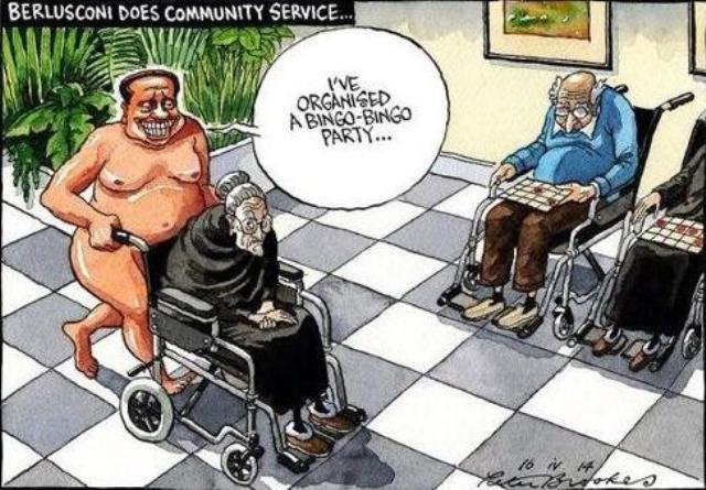 Ο λόγος προφανής: Το Μπίνγκο είναι ένα παιχνίδι τύχης ιδιαίτερα δημοφιλές στους ηλικιωμένους και ο γελοιογράφος των Times φαίνεται πεπεισμένος ότι ο Μπερλουσκόνι δεν θα παρατήσει εύκολα την αγαπημένη του συνήθεια, ακόμα και αν αυτό σημαίνει ότι πρέπει να οργανώσει ένα «μπίνγκο-μπίνγκο» πάρτι και να εμφανιστεί σε αυτό… γυμνός!