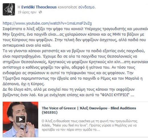 Και έγραψε χαρακτηριστικά: «Σαφέστατα ο Άλεξ αξίζει την ψήφο του κοινού! Υπέροχος τραγουδιστής και μουσικός. Μην ξεχνάτε, ένα παιχνίδι είναι…ας χαλαρώσουν κάποιοι και ας ΜΗΝ τα βάζουν με τους Κύπριους που ψηφίζουν. Στην τελική δεν ψηφίζουν άσχετους, αλλά παιδιά που αντικειμενικά είναι όλα καλά.