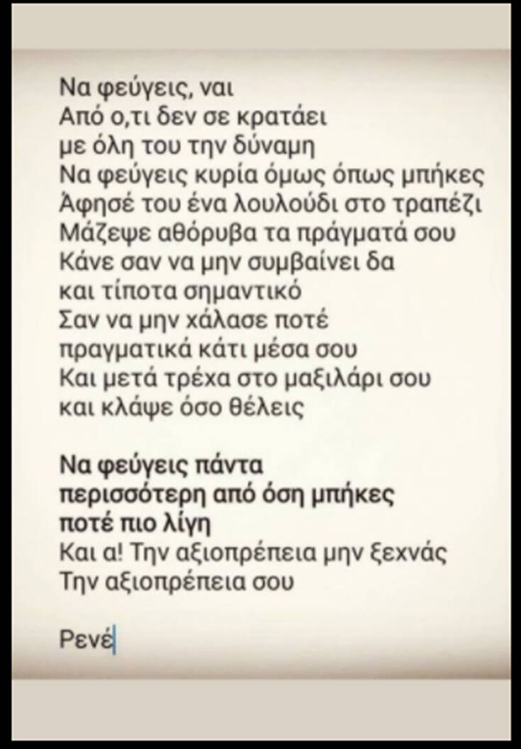 Και μετά τρέχα στο μαξιλάρι σου και κλάψε όσο θες. Να φεύγεις πάντα περισσότερη απ’ όση μπήκες, ποτέ πιο λίγη. Και α! Την αξιοπρέπεια μην ξεχνάς. Την αξιοπρέπειά σου» έγραψε η δημοσιογράφος.