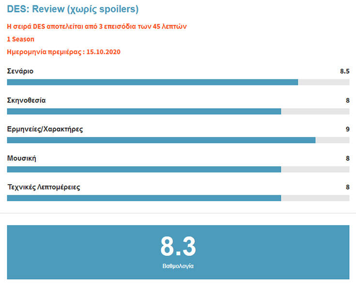 Τα τρία επεισόδια ίσως είναι λίγο ατελή, καθώς δεν ασχολούνται διεξοδικά με το πλαίσιο του Nilsen, αλλά δεν αφήνουν και κενά στη βασική ιστορία. Για τους θεατές που βλέπουν σειρές με αληθινούς εγκληματίες, το «Des» θα είναι ικανοποιητικό προσφέροντας ένα συναρπαστικό δράμα με εντυπωσιακές και φρικιαστικές πραγματικές λεπτομέρειες.