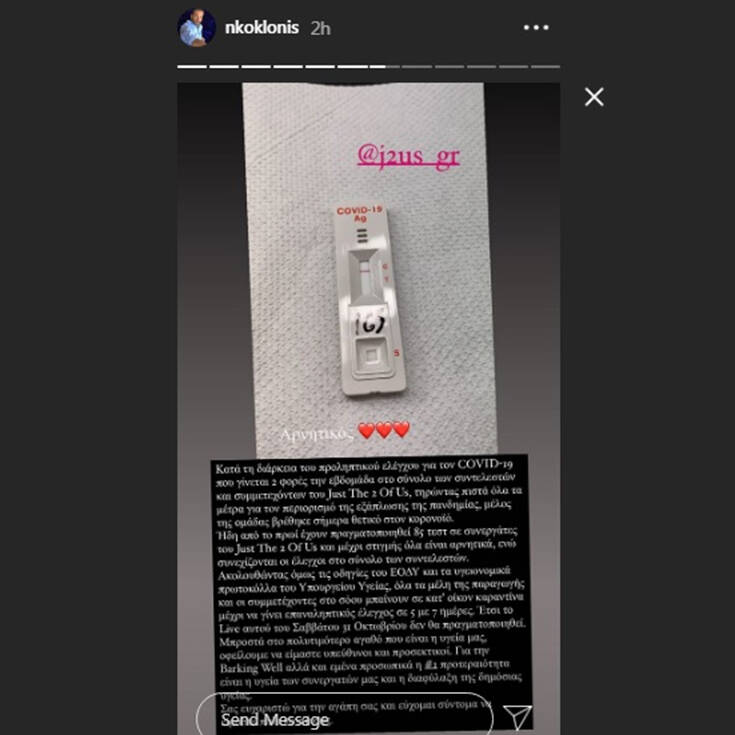 Αναλυτικά ο Νίκος Κοκλώνης έγραψε: «Κατά τη διάρκεια του προληπτικού ελέγχου για τον COVID – 19 που γίνεται 2 φορές την εβδομάδα στο σύνολο των συντελεστών και συμμετεχόντως του J2US, τηρώντας πιστά όλα τα μέτρα για τον περιορισμό της εξάπλωσης της πανδημίας, μέλος της ομάδας βρέθηκε θετικό στον κορονοϊό.