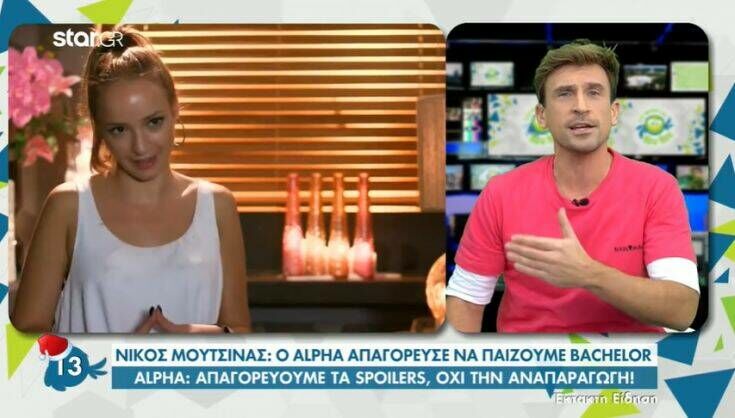 «Έχουμε μια είδηση που συνέβη χθες το μεσημέρι. Βγαίνει ο Νίκος Μουτσινάς στην εκπομπή και με πολύ χιούμορ αλλά και λίγο ενόχληση, η οποία φαινόταν, λέει πως ο Alpha του έχει απαγορέψει να παίζει το Bachelor.