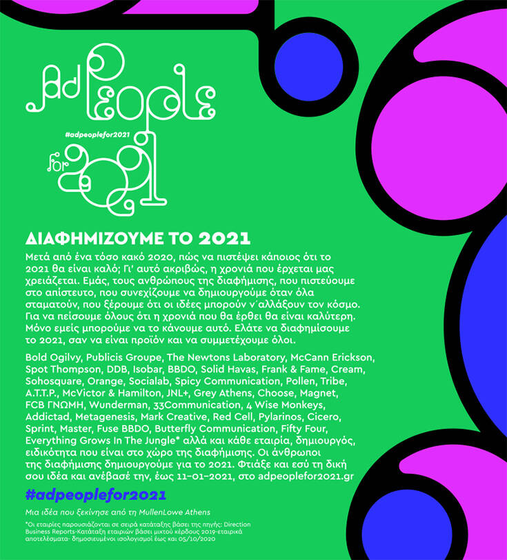 Πώς θα διαφημίζαμε το 2021 αν ήταν προϊόν; Με αυτή την ιδέα η MullenLowe Athens, μέσω της ενέργειας #adpeoplefor2021 , προσκαλεί τους ανθρώπους της διαφήμισης, είτε εργάζονται σε εταιρίες, είτε είναι ανεξάρτητοι δημιουργοί και ανήκουν στον ευρύτερο χώρο της διαφήμισης, να προσφέρουν και τη δική τους ιδέα για να διαφημιστεί η χρονιά που έρχεται.