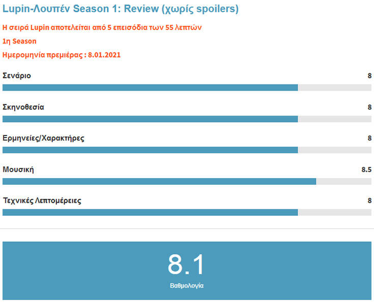 Τελική Ετυμηγορία: Η γαλλική σειρά Lupin είναι μια τηλεοπτική έκπληξη της νέας χρονιάς. Αποτελούμενη από μια εξωφρενική ληστεία και έναν χαρακτήρα που κάνει ό, τι καλύτερο μπορεί για να αποκαλύψει την αλήθεια – είναι μια μικρή και απλή- αλλά ενδιαφέρουσα- σειρά που θα σας κερδίσει.