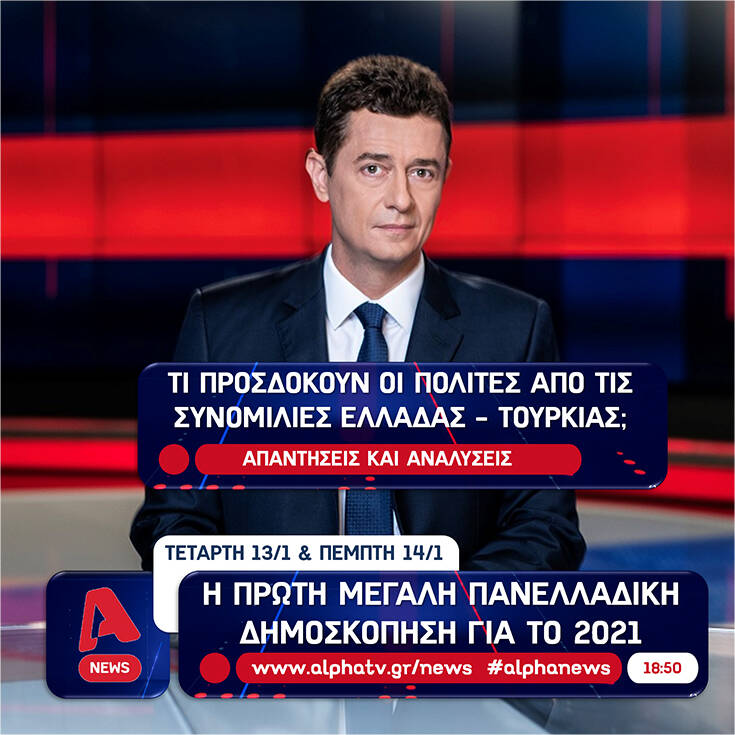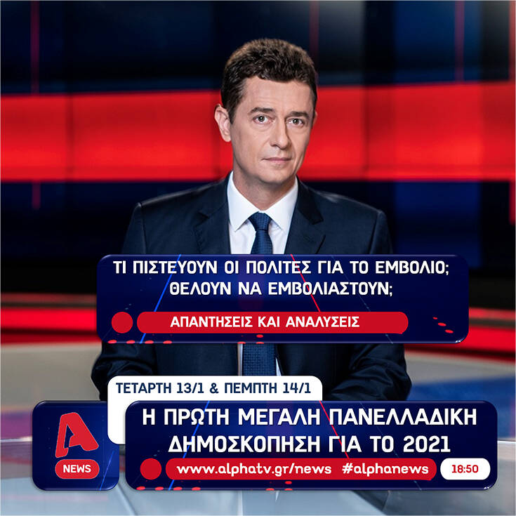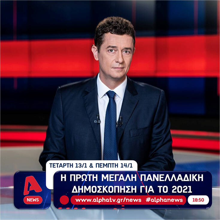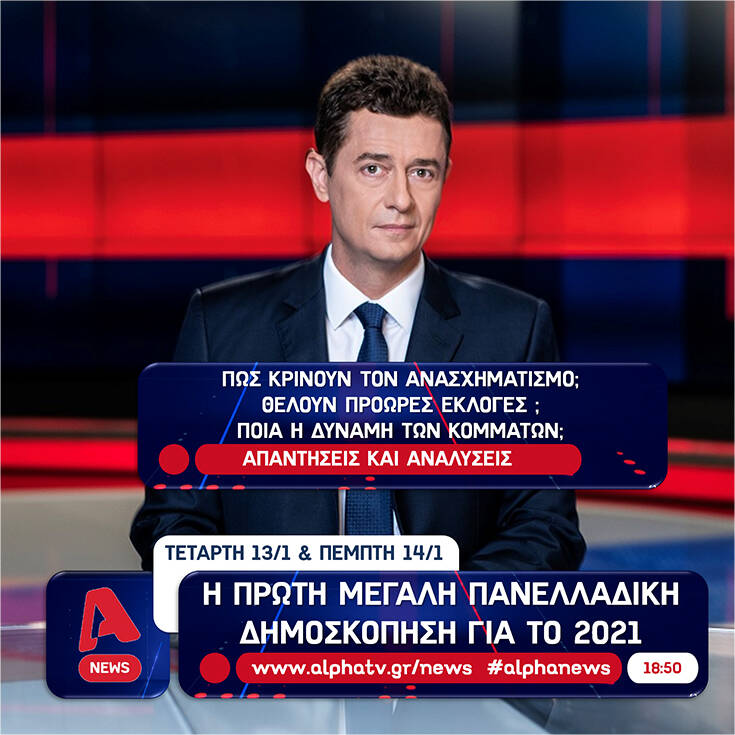 Η πρώτη μεγάλη πανελλαδική δημοσκόπηση για το 2021 θα μεταδοθεί απόψε στο κεντρικό δελτίο ειδήσεων του Alpha και θα αποτυπώσει τη γνώμη των πολιτών για τα θέματα που «καίνε» την επικαιρότητα.