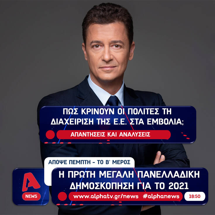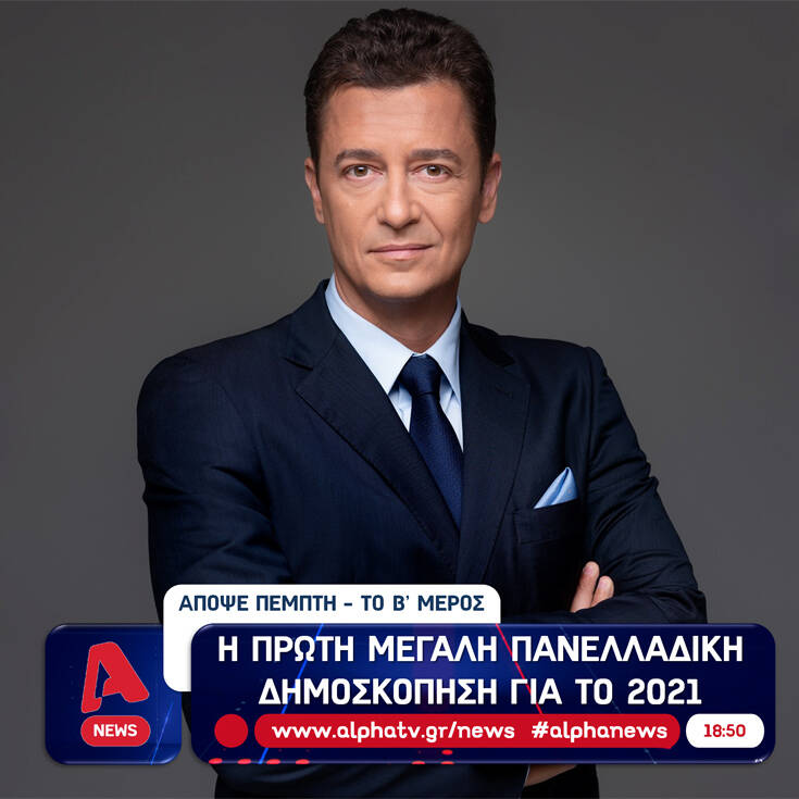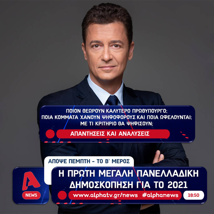 Απόψε στις 18:50 στο κεντρικό δελτίο ειδήσεων του Alpha θα παρουσιαστεί το δεύτερο μέρος της δημοσκόπησης, στην θα αποτυπωθεί η άποψη των Ελλήνων για θέματα της επικαιρότητας.