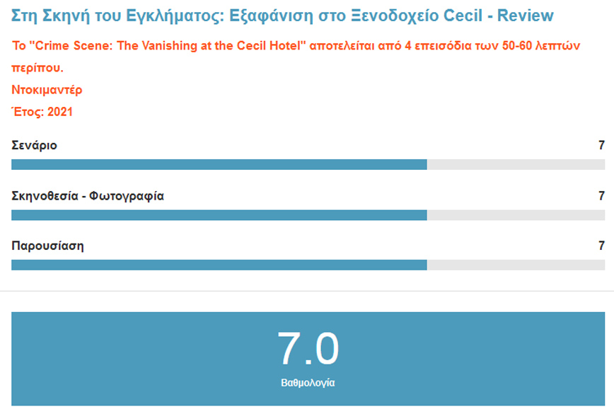 Μιλάμε για το «Crime Scene: The Vanishing at the Cecil Hotel – Στη Σκηνή του Εγκλήματος: Εξαφάνιση στο Ξενοδοχείο Cecil» που έκανε πρεμιέρα πριν λίγες ημέρες και βρίσκεται ήδη μέσα στο Ελληνικό τοπ 10 στις σειρές.