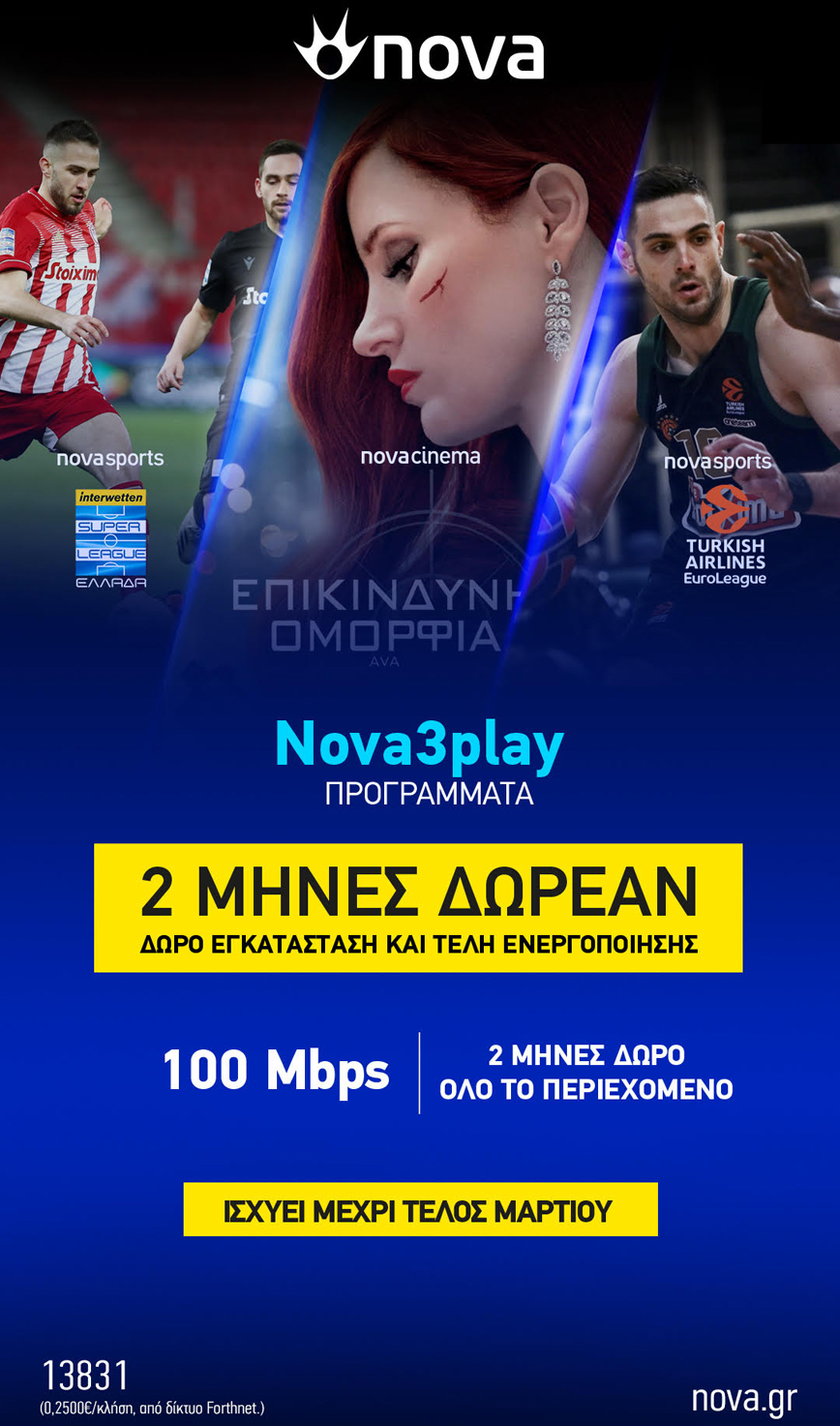 Η μοναδική αυτή προσφορά της Nova γίνεται ακόμη καλύτερη, καθώς οι νέοι συνδρομητές όλων των προγραμμάτων Νοva3play με Internet 100 Mbps, θα έχουν για 2 μήνες τη Nova στο Full, έχοντας πρόσβαση δωρεάν σε όλο το πλούσιο περιεχόμενο της πρώτης ψηφιακής δορυφορικής συνδρομητικής τηλεοπτικής πλατφόρμας στην Ελλάδα! Έτσι, θα γνωρίσουν το μαγικό κόσμο της Nova και θα απολαύσουν τα συναρπαστικά ντέρμπι που έρχονται στο Ελληνικό Πρωτάθλημα Ποδοσφαίρου, στην EuroLeague και στα ξένα πρωταθλήματα, το μοναδικό κινηματογραφικό περιεχόμενο με τις κορυφαίες σειρές και τα μεγαλύτερα blockbusters, καθώς και αξιόπιστο Internet έως 100Mbps και απεριόριστη τηλεφωνία προς σταθερά, ή και προς κινητά Ελλάδος.