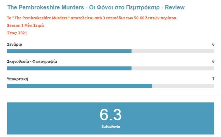 Κλείνοντας αν και όπως έχω δηλώσει πολλές φορές για την προτίμησή μου στις αστυνομικές σειρές, η σειρά «The Pembrokeshire Murders – Οι Φόνοι στο Πεμπρόκσιρ» δεν με ενθουσίασε ιδιαίτερα και πιστεύω σαν υλικό μπορούσαν να το διαχειριστούν καλύτερα μιας και η ιστορία ήταν αληθινή και αρκετά ενδιαφέρουσα. Η σειρά προβάλεται από την COSMOTE TV και όπως είπαμε παραπάνω με μόλις τρία επεισόδια δεν θα χάσετε και τον χρόνο σας.