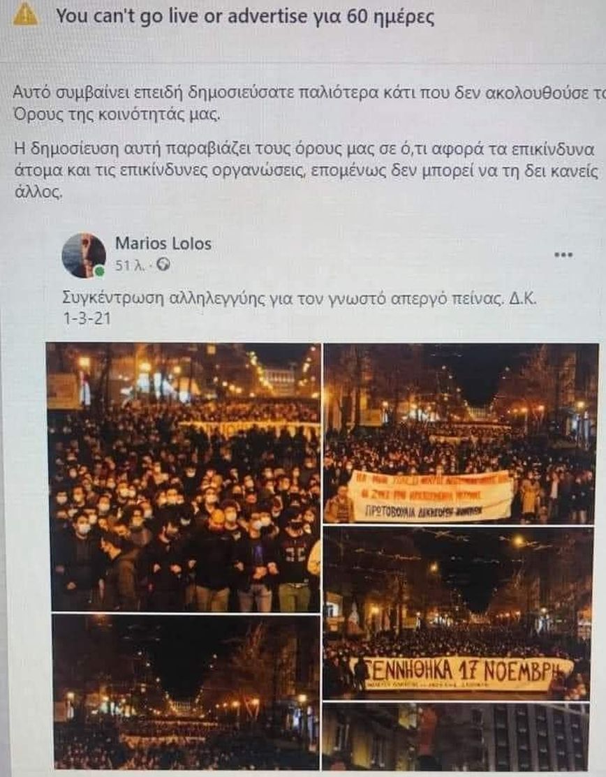 «Αυτό συμβαίνει επειδή δημοσιεύσατε παλιότερα κάτι που δεν ακολουθούσε τους Όρους της κοινότητά μας. Η δημοσίευση αυτή παραβιάζει τους όρους μας σε ό,τι αφορά τα επικίνδυνα άτομα και τις επικίνδυνες οργανώσεις, επομένως δεν μπορεί να τη δει κανείς άλλος», αναφέρει στην αιτιολόγησή του το Facebook, το οποίο δεν φαίνεται να έλαβε υπόψιν του το γεγονός ότι πρόκειται για επαγγελματία φωτογράφο και πως τις προηγούμενες φορές και πάλι είχε δημοσιεύσει μέρος της δουλειάς του από τις πορείες που είχαν πραγματοποιηθεί τις προηγούμενες ημέρες.
