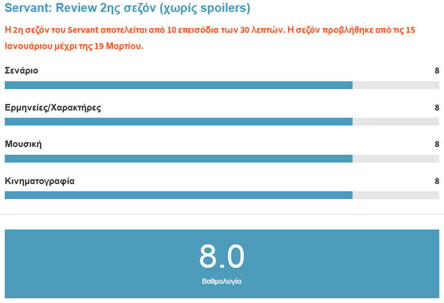 Το Servant σίγουρα είναι μία slow burn σειρά, η οποία καταφέρνει με το μυστήριο και την σκοτεινή ατμόσφαιρά της, να μας κρατήσει αμείωτο το ενδιαφέρον μέχρι το τέλος. Τα επεισόδια είναι 30 λεπτα και μπορείτε άνετα να κάνετε binge watching.