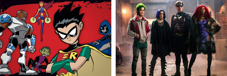 Η σειρά Titans έκανε πρεμιέρα το 2018 στο DC Universe με πρωταγωνιστές τους Brenton Thwaites, Teagan Croft, Anna Diop, Ryan Potter, Curran Walters κ.α.