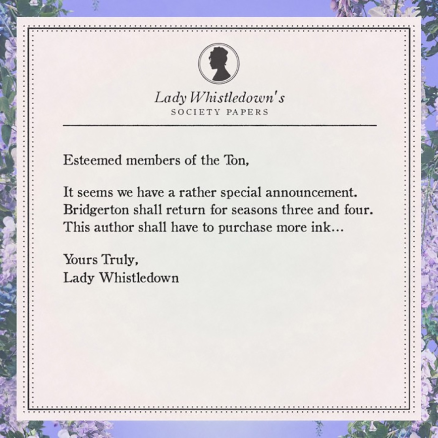 Με ένα λακωνικό γράμμα, η Lady Whistledown μας ενημέρωσε πως η δημοφιλής σειρά του Netflix, Bridgerton θα επιστρέψει για 3η και 4η σεζόν.