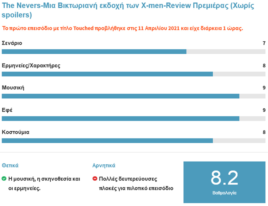 Η πρεμιέρα της σειράς The Nevers ήταν σίγουρα μία εντυπωσιακή αρχή και μία καλή εισαγωγή στην ιστορία των Touched που όμως σε μερικά σημεία χάνεται. Υπάρχουν αρκετές δευτερεύουσες πλοκές που για πιλοτικό επεισόδιο θα λέγαμε πως ήταν κάπως χαοτικό αλλά σίγουρα αυτό μας δείχνει πως θα ακολουθήσουν αρκετά ενδιαφέροντα πράγματα στην συνέχεια του 1ο μέρους της σειράς.