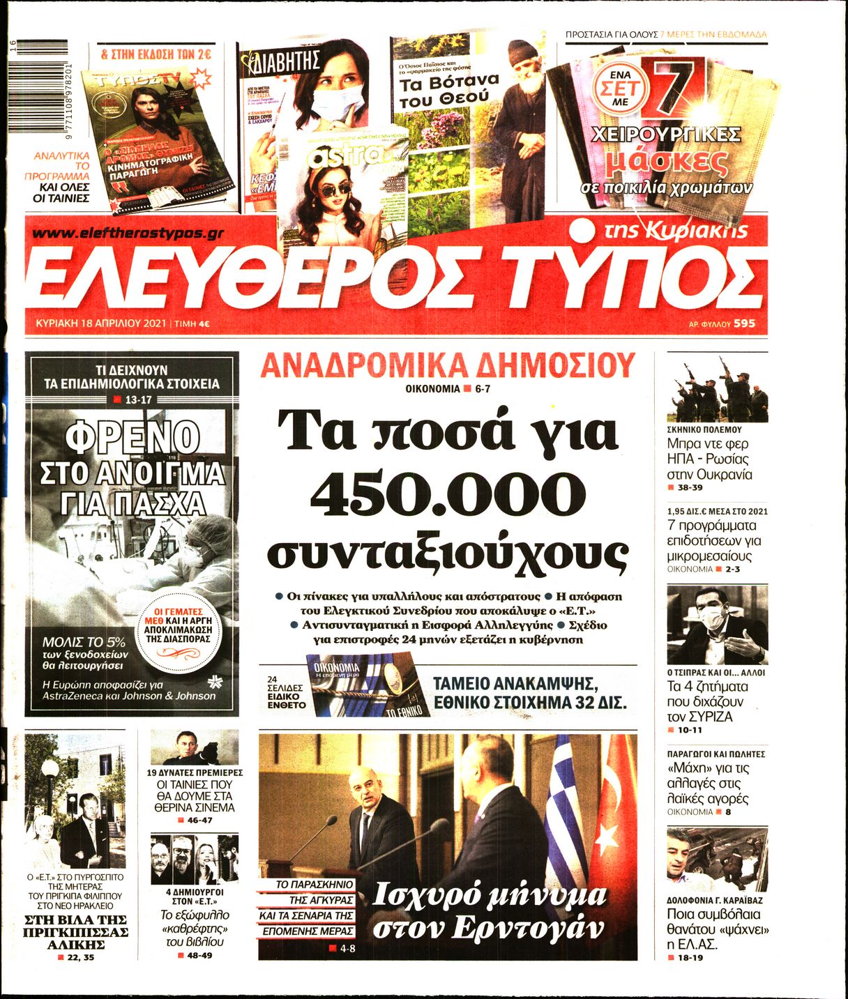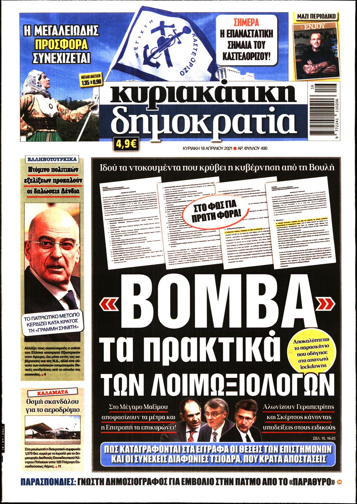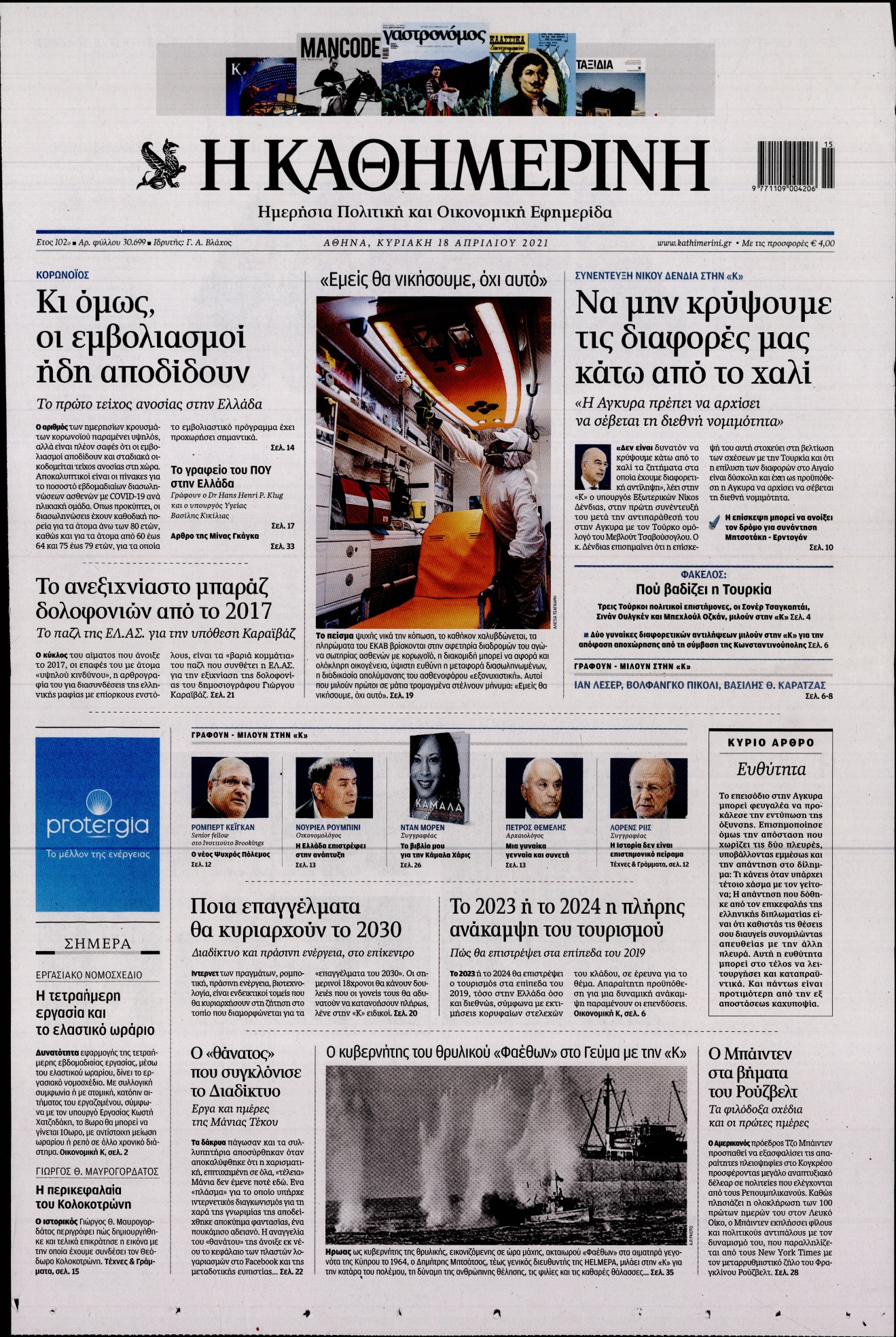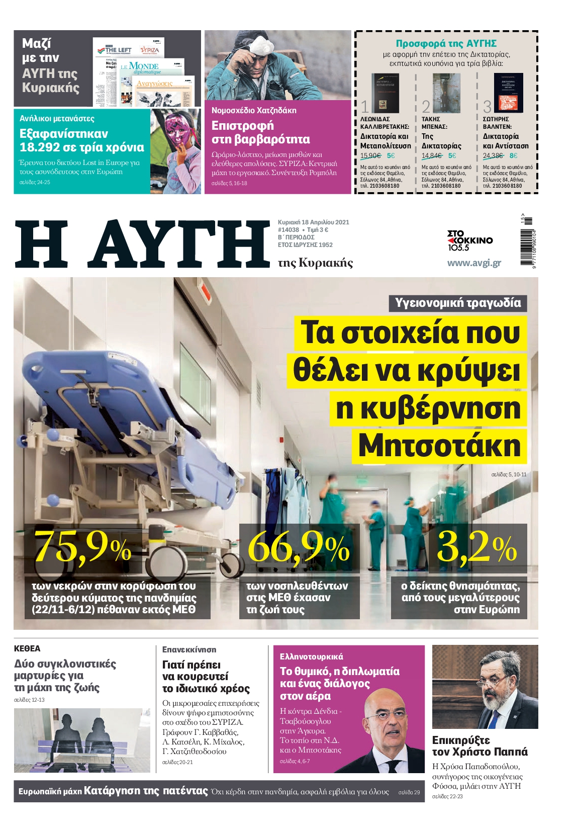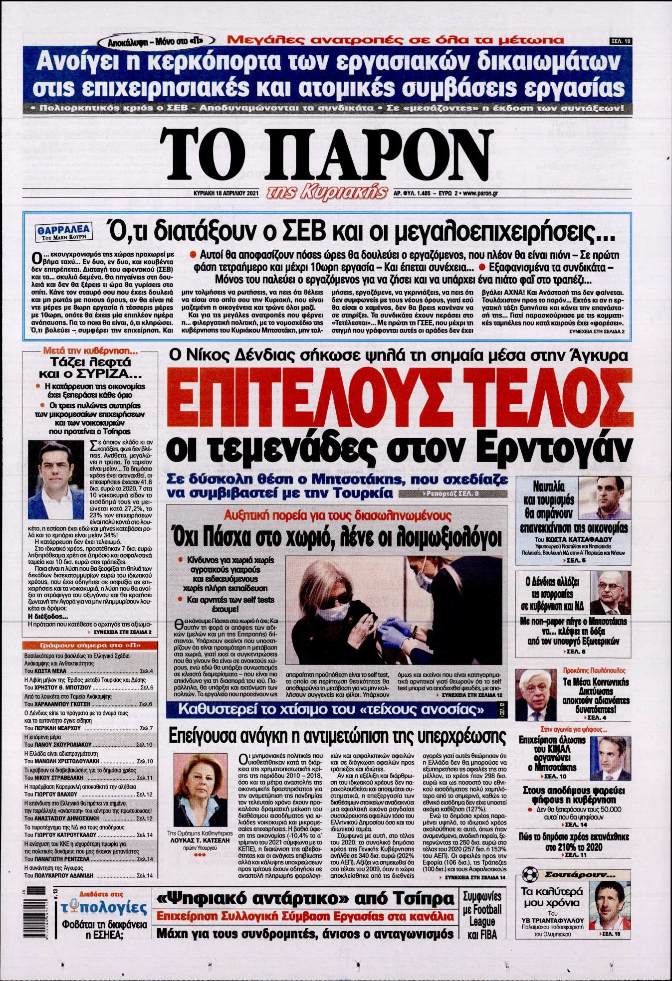 Η πορεία της πανδημίας στη χώρα και οι σχέσεις της Ελλάδας με την Τουρκία έπειτα από την επίσκεψη Δένδια στην Άγκυρα είναι μεταξύ άλλων τα θέματα που κυριαρχούν στα πρωτοσέλιδα των κυριακάτικων εφημερίδων.