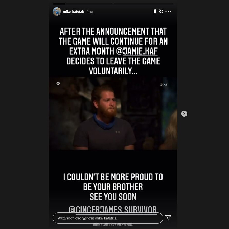 Ο αδερφός του James Καφετζή, Mike, μέσω ενός instastory αποκάλυψε πως ο αδερφός αποφάσισε να αποχωρήσει οικειοθελώς από το Survivor. Ο λόγος που ο δυνατός παίκτης του φετινού Survivor και για πολλούς φαβορί για το τελικό έπαθλο, αποφάσισε να αποχωρήσει οικειοθελώς έγκειται στο γεγονός ότι η παραγωγή αποφάσισε να παρατείνει το reality για ένα μήνα ακόμα.