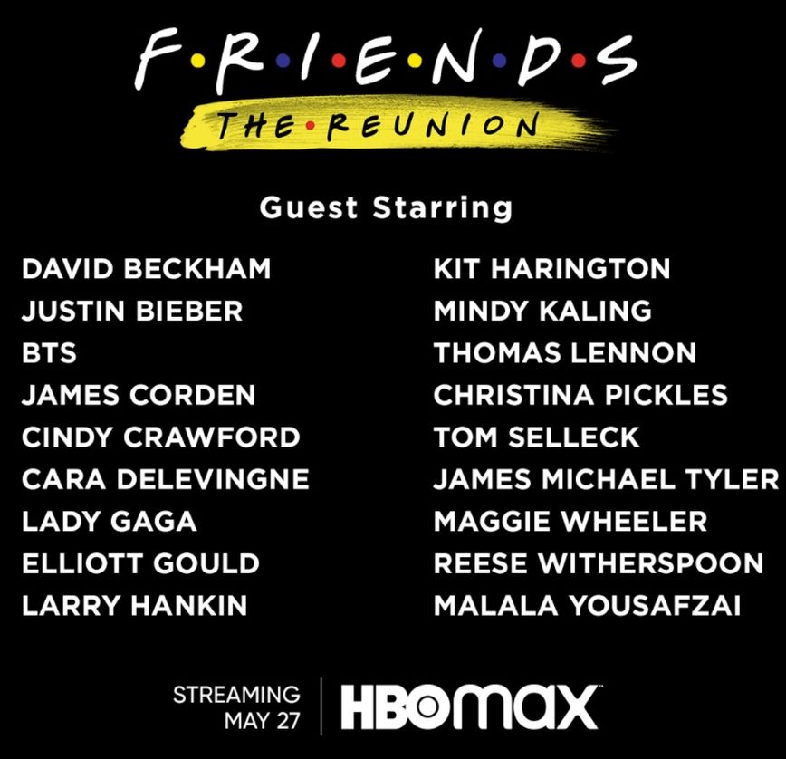 Συγκεκριμένα στο «Friends: The Reunion» που θα ανέβει στην πλατφόρμα την επόμενη Πέμπτη θα υπάρχουν πολλοί καλεσμένοι όπως, μεταξύ άλλων, ο Ντέιβιντ Μπέκαμ, ο Τζάστιν Μπίμπερ, τα μοντέλα Κάρα Ντελεβίν και Σίντι Κρόφορντ, οι κωμικοί Τζέιμς Κόρντεν και Μίντι Κάλινγκ, η τραγουδίστρια Lady Gaga, και η βραβευμένη με το Νομπέλ Ειρήνης Μαλάλα Γιουσαφζάι.