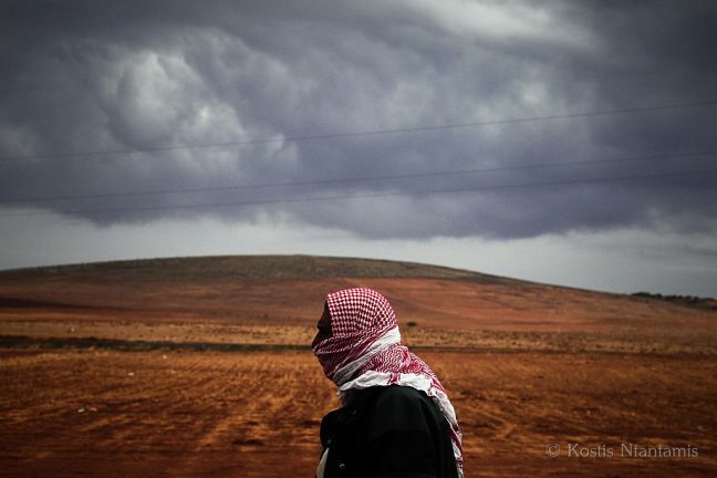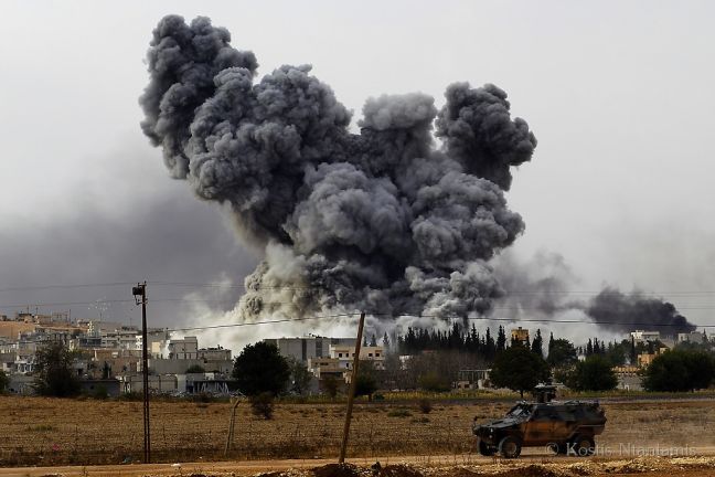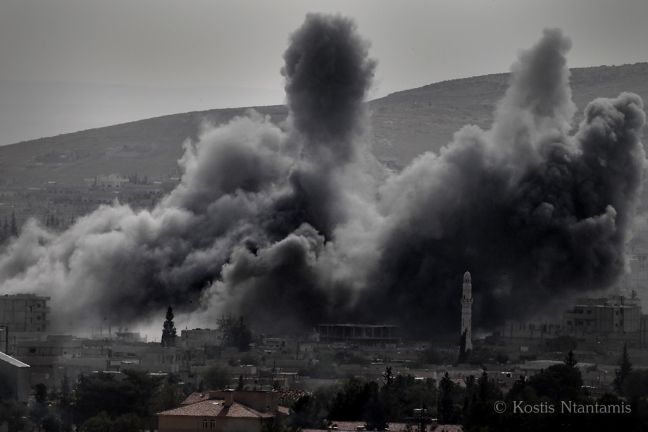 Από την πρώτη μέρα ήθελα να βρεθώ όσο ήταν δυνατόν πιο κοντά στο Κομπάνι. Φτάνοντας λοιπόν με το αμάξι στο Mursitpinar, ένα χωριό μερικές εκατοντάδες μέτρα από τα σύνορα, συναντήσαμε την αστυνομία. Ήμουν μαζί με δύο ακόμη φωτογράφους και έναν καμεραμάν, οι οποίοι μου ανέφεραν ότι τις προηγούμενες μέρες, όσο κι αν προσπάθησαν, δεν τους είχαν αφήσει να περάσουν από τον κεντρικό δρόμο που οδηγούσε στα σύνορα. Είχαν όμως βρει τρόπο να τους αποφεύγουν. Έτσι δεν προχωρήσαμε με τα αυτοκίνητα μέχρι το μπλόκο τους, άλλα σταματήσαμε πολύ πιο νωρίς και πιο αριστερά από τον κεντρικό δρόμο. Στο σημείο αυτό μπήκαμε άμεσα όλοι σε ένα αμάξι και πολύ γρήγορα φύγαμε στο χωματόδρομο για να μπούμε στο χωριό. Τελικά μετά από μερικούς ελιγμούς αφήσαμε το αμάξι σε ένα σημείο μέσα στο χωριό. Φορέσαμε τα κράνη και τα αλεξίσφαιρα και με πολύ προσοχή κατορθώσαμε να φτάσουμε στην αυλή ενός σπιτιού όπου οι συνάδελφοι είχαν βρει τις προηγούμενες μέρες. Η αυλή αυτή καθώς και μια αλάνα με ένα τοιχάκι λίγο πιο πέρα, ήταν τα μόνα σημεία τόσο κοντά στα σύνορα που μπορούσες να σταθείς και να φωτογραφίσεις Πιο συγκεκριμένα θα έλεγα, ότι βρισκόμουν ακριβώς μπροστά από την περιοχή που είχαν καταλάβει οι ISIS. Από εκεί αυτό που έβλεπα ήταν σε πρώτο πλάνο τανκς και άρματα του Τουρκικού στρατού, να περιπολούν κατά μήκος των συνόρων. Σε δεύτερη φάση φαινόταν το Κομπάνι. Λιγότερο από χιλιόμετρο από εκεί που βρισκόμουν. Το πρώτο που ήθελα να κοιτάξω ήταν ο λόφος που οι ISIS είχαν καταλάβει και τοποθετήσει τη σημαία τους. Το δεύτερο ήταν να προσπαθήσω να διακρίνω κάποια κίνηση στην περιοχή, όπου γίνονταν οι μάχες. Αφού ξεκίνησα να φωτογραφίζω κάποιες εκρήξεις από όλμους, μετά από πολύ λίγο ακούστηκαν μαχητικά αεροσκάφη. Ετοιμάστηκα και σχεδόν αμέσως υπήρξε μια μεγάλη έκρηξη και άλλες τέσσερις μικρότερες. Άρχισα να πατάω το κουμπί του κλείστρου της κάμερας. Αμέσως ένιωσα και το ωστικό κύμα από την έκρηξη. Συνέχισα και φωτογράφιζα. Όσο αναδυόταν ο καπνός τόσο καδράριζα και φωτογράφιζα…