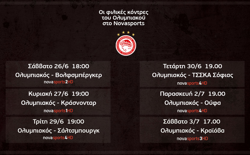 - Κυριακή 27/6, 19:00: Ολυμπιακός-Κράσνονταρ, Novasports1HD