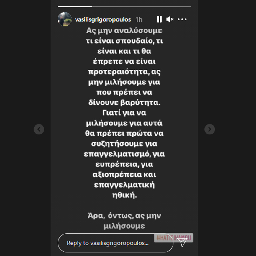 Ο δημοσιογράφος σε ένα instagram story ανέφερε πως πριν αναφερθεί κανείς σε πρόσωπα και πράγματα θα πρέπει να μιλήσει για ευπρέπεια, αξιοπρέπεια και επαγγελματική ηθική.