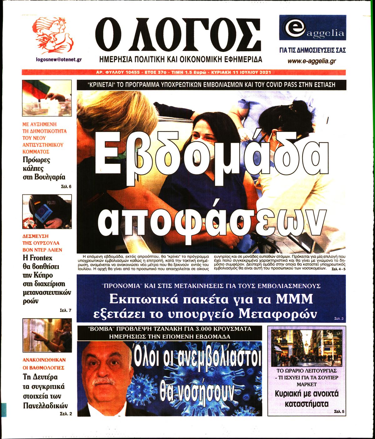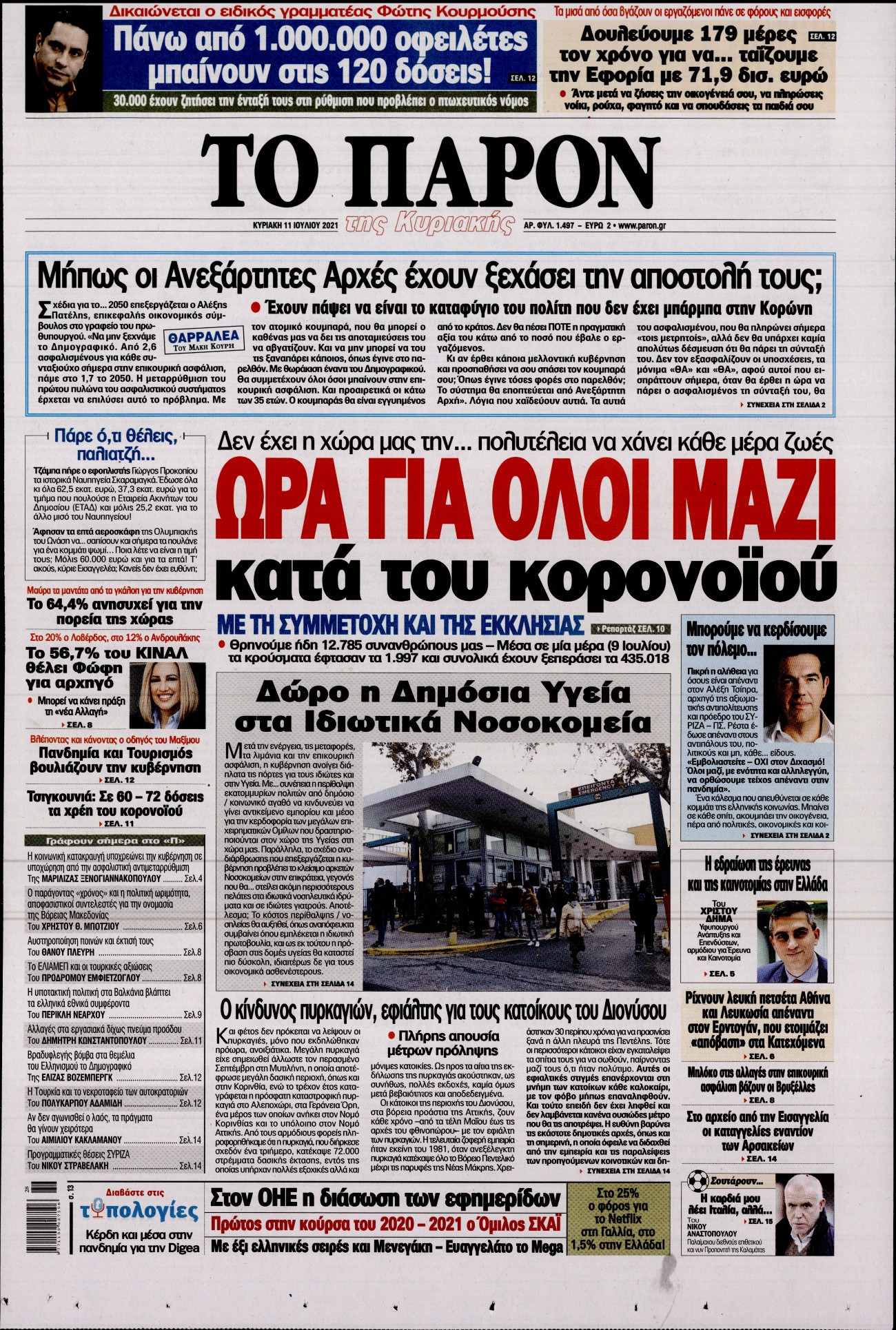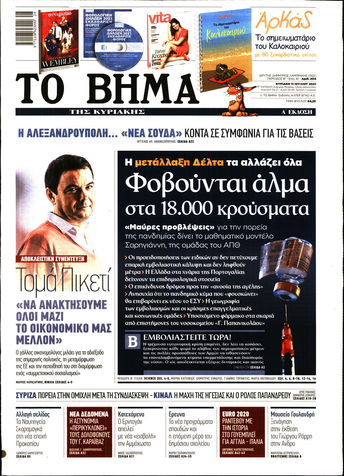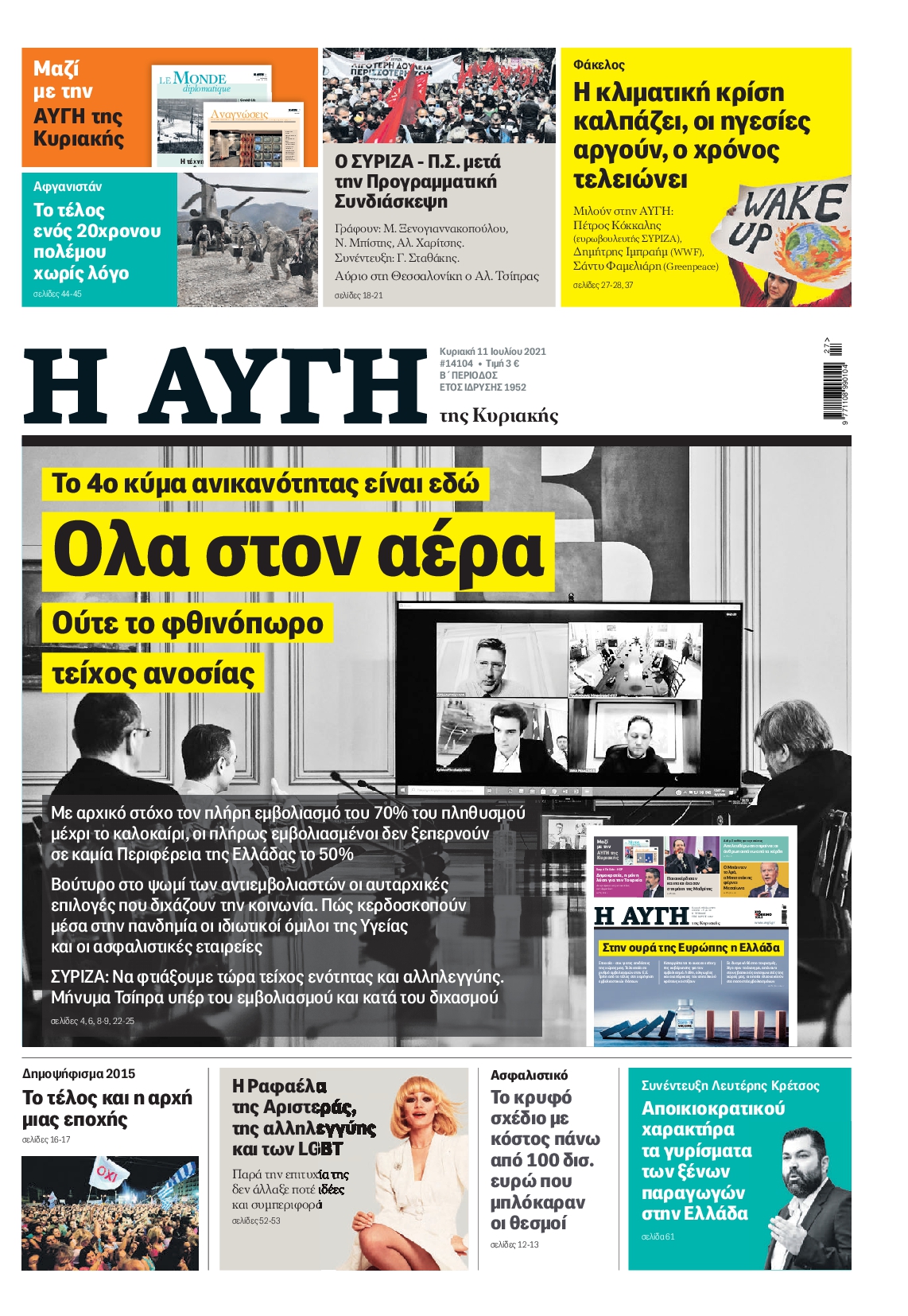 Το τέταρτο κύμα της πανδημίας, η μετάλλαξη Delta και η πορεία των εμβολιασμών είναι μεταξύ άλλων τα θέματα που κυριαρχούν στα πρωτοσέλιδα των κυριακάτικων εφημερίδων.
