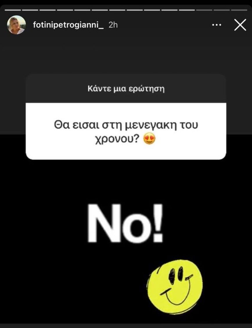Η δημοσιογράφος, ωστόσο, μέσω των Social Media και μέσα από ένα διαδικτυακό Q&A διέψευσε τις φήμες που την ήθελαν ξανά μαζί με την Ελένη Μενεγάκη. Η απάντηση ήταν ένα μονολεκτικό «όχι» και συνοδευόταν από μία χαμογελαστή φατσούλα.