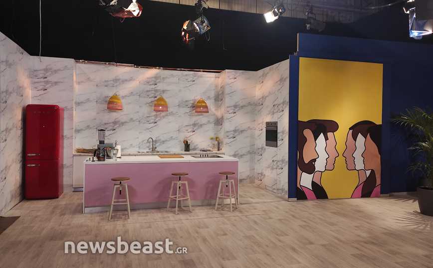 Στη μέση του πλατό, υπάρχει ο αγαπημένος μπλε καναπές τους τον οποίο δεν αποχωρίζονται ποτέ και φυσικά πήραν μαζί τους στο νέο τους επαγγελματικό σπίτι.