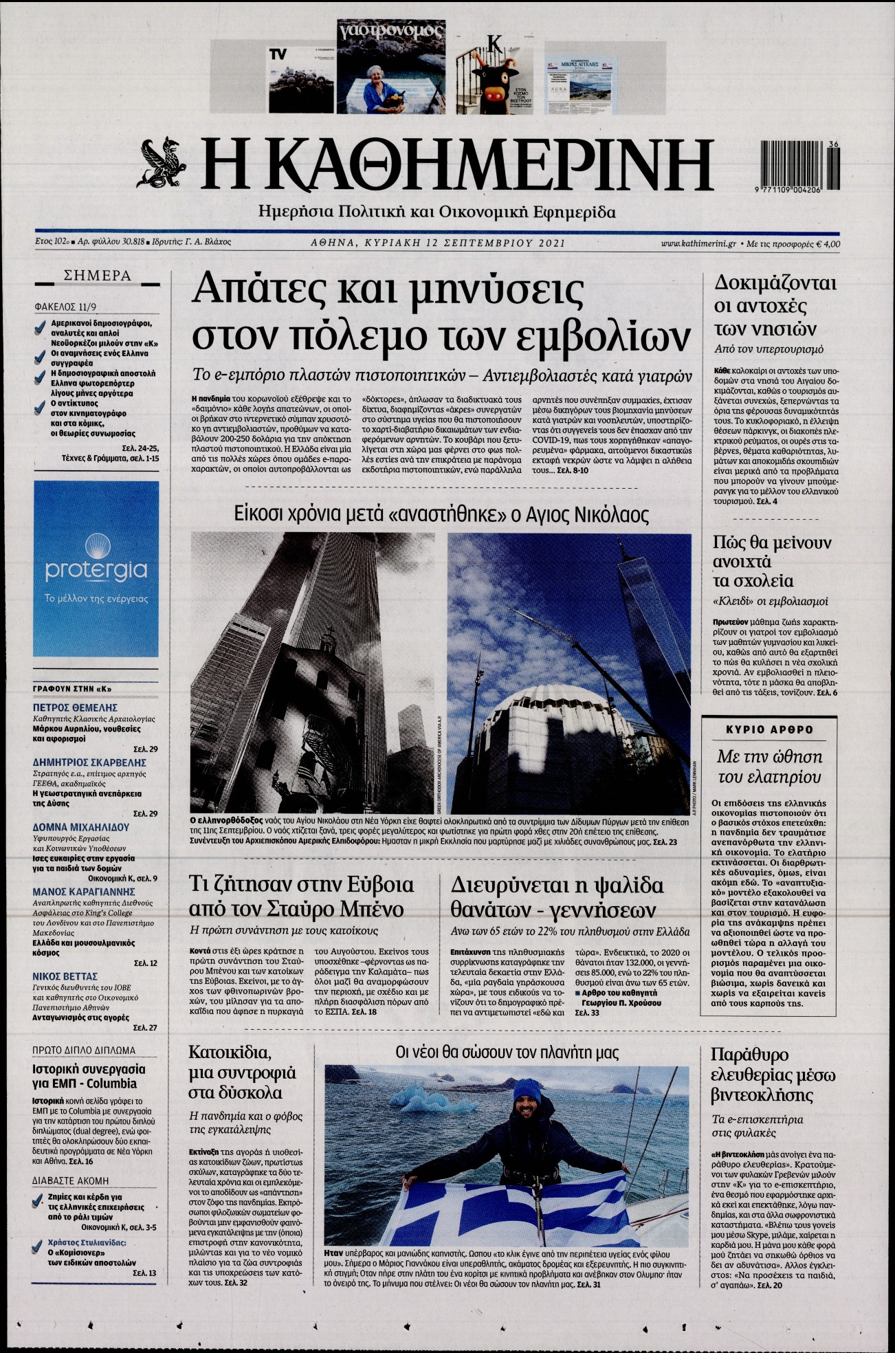 Το κυβερνητικό σχέδιο για ανάπτυξη και οι «μαϊμού» εμβολιασμοί ξεχωρίζουν μεταξύ άλλων στα πρωτοσέλιδα των κυριακάτικων εφημερίδων.
