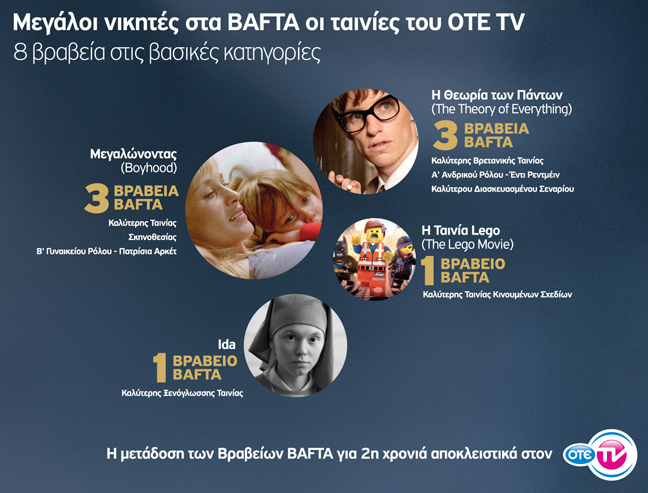 Οκτώ βραβεία σε όλες τις βασικές κατηγορίες απέσπασαν στη χθεσινή απονομή των 68ων Βραβείων Βρετανικής Ακαδημίας Κινηματογράφου (BAFTA) οι ταινίες που έχει εξασφαλίσει ο OTE TV σε Α’ τηλεοπτική προβολή στα κανάλια OTE CINEMA τη φετινή σεζόν.