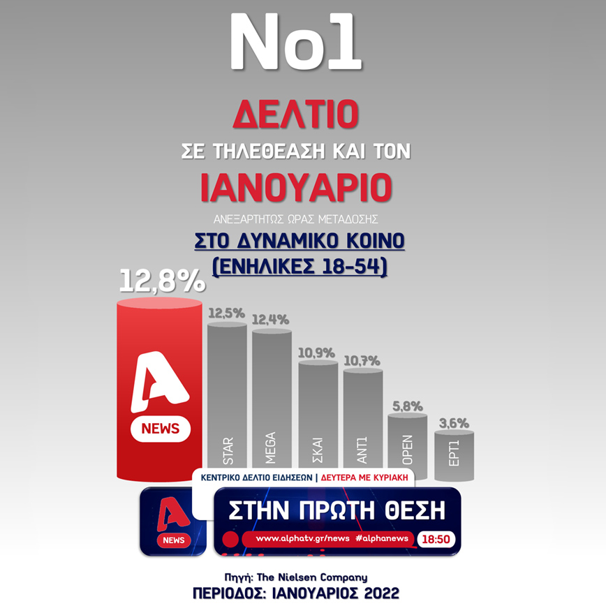 Ο πρώτος μήνας του χρόνου έκλεισε με πρωτιά για το Κεντρικό Δελτίο Ειδήσεων του Alpha. Τον Ιανουάριο το Alpha News τερμάτισε πρώτο στον πίνακα τηλεθέασης στο δυναμικό κοινό 18-54, με μέσο όρο 12,8%, (Δευτέρα έως και Κυριακή, ανεξαρτήτως ώρας μετάδοσης), επιβεβαιώνοντας ότι η πολυθεματική, γρήγορη και άμεση πληροφόρηση που προσφέρει, με τα εξελιγμένα γραφήματα και γραφικά στοιχεία, το έχουν αναγάγει στο δημοφιλέστερο δελτίο ειδήσεων, το οποίο βρίσκεται μπροστά από τον ανταγωνισμό σε όλους τους τομείς.
