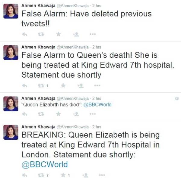 Η δημοσιογράφος του βρετανικού δικτύου, Ahmen Khawaja, δημοσίευσε στο λογαριασμό που διατηρεί στο Twitter ότι η 89χρονη βασίλισσα μεταφέρθηκε στο νοσοκομείο. Λίγο αργότερα δημοσίευσε πως «Η Βασίλισσα Ελισάβετ πέθανε».