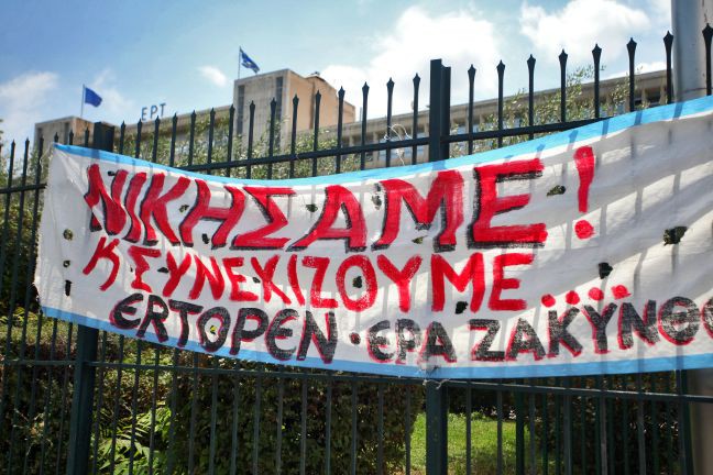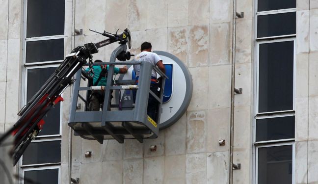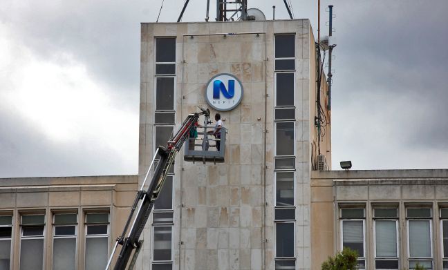 Από νωρίς το πρωί, συνεργεία ανέλαβαν να βγάλουν το σήμα της ΝΕΡΙΤ για να το αντικαταστήσουν με αυτό της ΕΡΤ. Για την ακρίβεια, με γερανό απομακρύνθηκαν τα γράμματα «Ν» και «Ι», το «Τ» ήρθε πιο κοντά και προέκυψε και πάλι το ΕΡΤ.