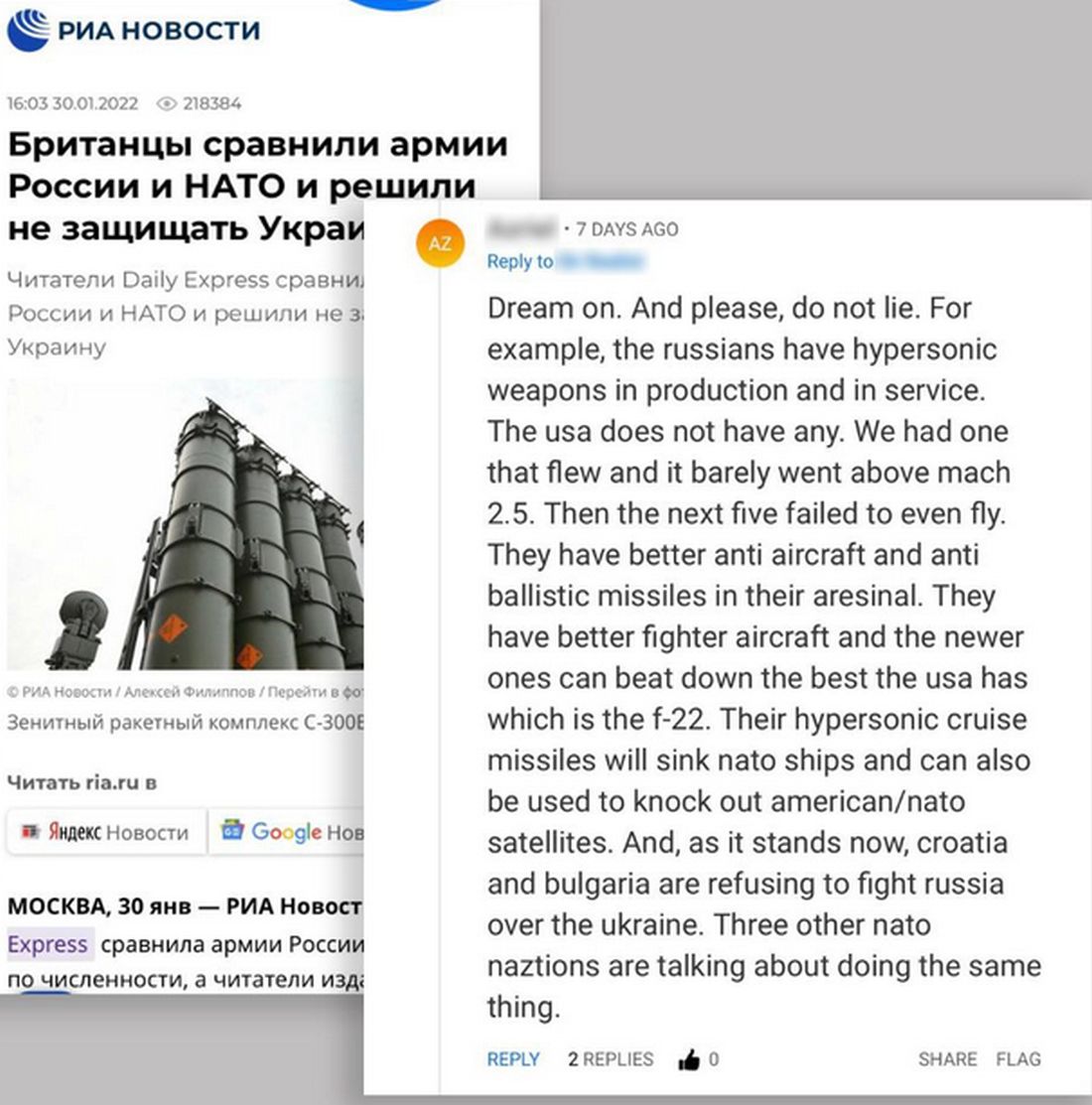 Ένα άρθρο που δημοσιεύτηκε στον ιστότοπο του κρατικού πρακτορείου ειδήσεων RIA Novosti στα τέλη Ιανουαρίου υποστήριξε ότι οι «Βρετανοί» αναγνώστες της Daily Express υποστήριξαν την άποψη ότι η Ουκρανία δεν πρέπει να υπερασπιστεί τα συμφέροντά της επειδή η Ρωσία είχε ισχυρότερη στρατιωτική παρουσία στην περιοχή από το ΝΑΤΟ.
