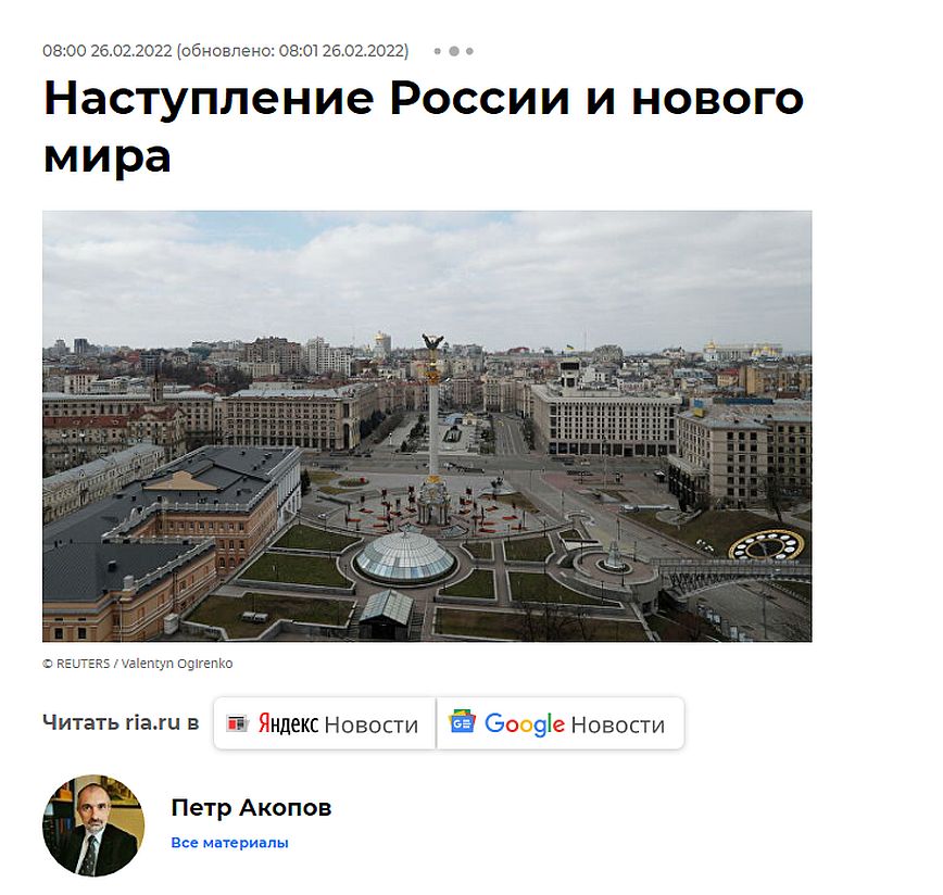 Προφανώς θα γράφτηκε υπό την προϋπόθεση ότι οι ρωσικές Ένοπλες Δυνάμεις θα είχαν καταλάβει το Κίεβο και θα είχαν υποτάξει τη χώρα. Ωστόσο κάτι τέτοιο δεν συνέβη. Έτσι λοιπόν το κρατικό πρακτορείο ειδήσεων διέγραψε το συγκεκριμένο άρθρο και το συγκεκριμένο σχέδιο είναι σαν να μην δημοσιεύθηκε ποτέ.