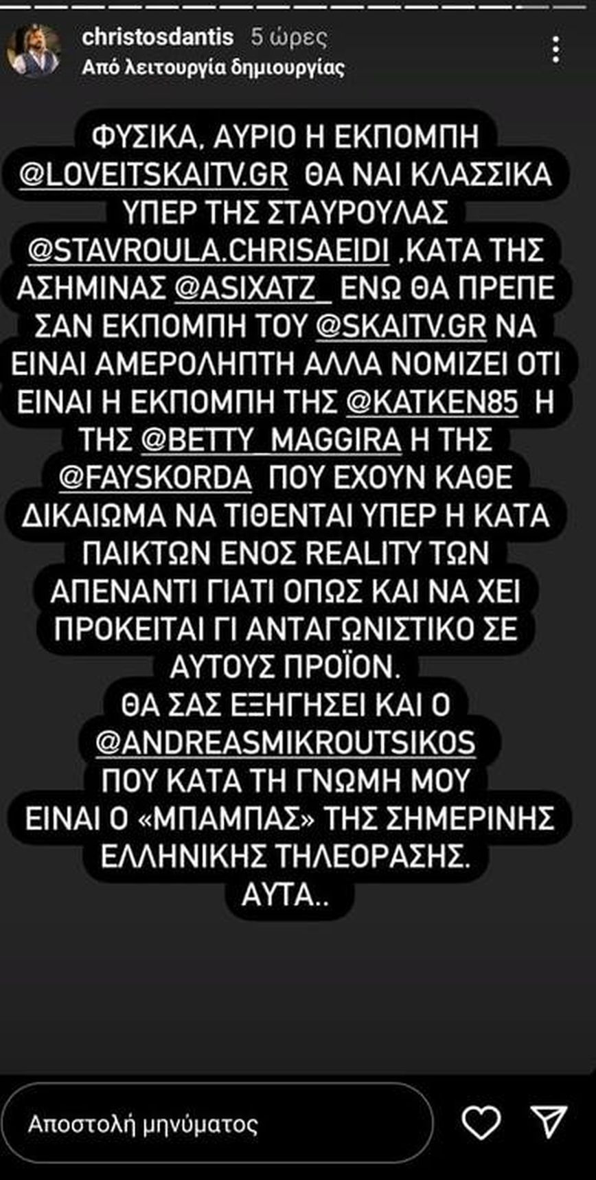 Πριν από μερικές ημέρες, ο Χρήστος Δάντης είχε γράψει μεταξύ άλλων στα social media για τη σύντροφό του Ασημίνα Χατζηανδρέου:: «Ασημίνα πόσο πόλεμο θα φας και θα αντέξεις; Σε θαυμάζω. Φυσικά αύριο η εκπομπή Love it θα είναι κλασικά υπέρ της Σταυρούλας και κατά της Ασημίνας, ενώ θα έπρεπε σαν εκπομπή του ΣΚΑΙ να είναι αμερόληπτη».