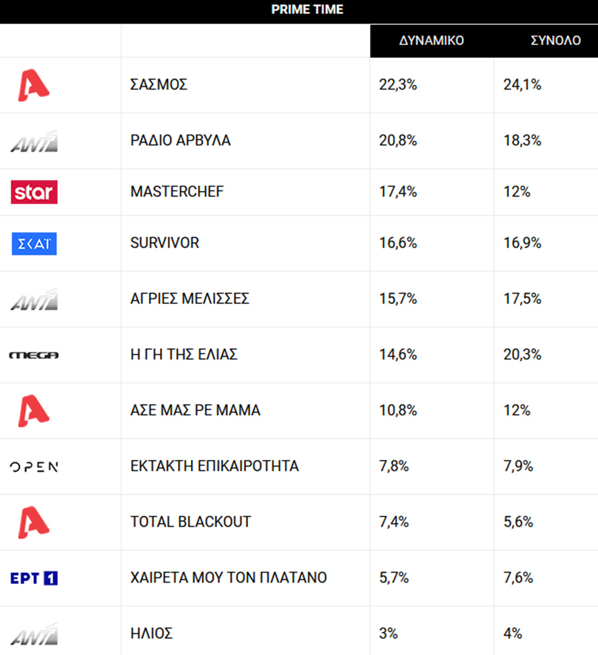 Η σειρά που φέρνει άρωμα από την Κρήτη συγκέντρωσε 22,3% στο δυναμικό κοινό και 24,1% στο γενικό σύνολο. Στη δεύτερη θέση το Ράδιο Αρβύλα με 20,8% και 18,3% αντίστοιχα και στην τρίτη θέση του Masterchef με ποσοστά 17,4% και 12%.
