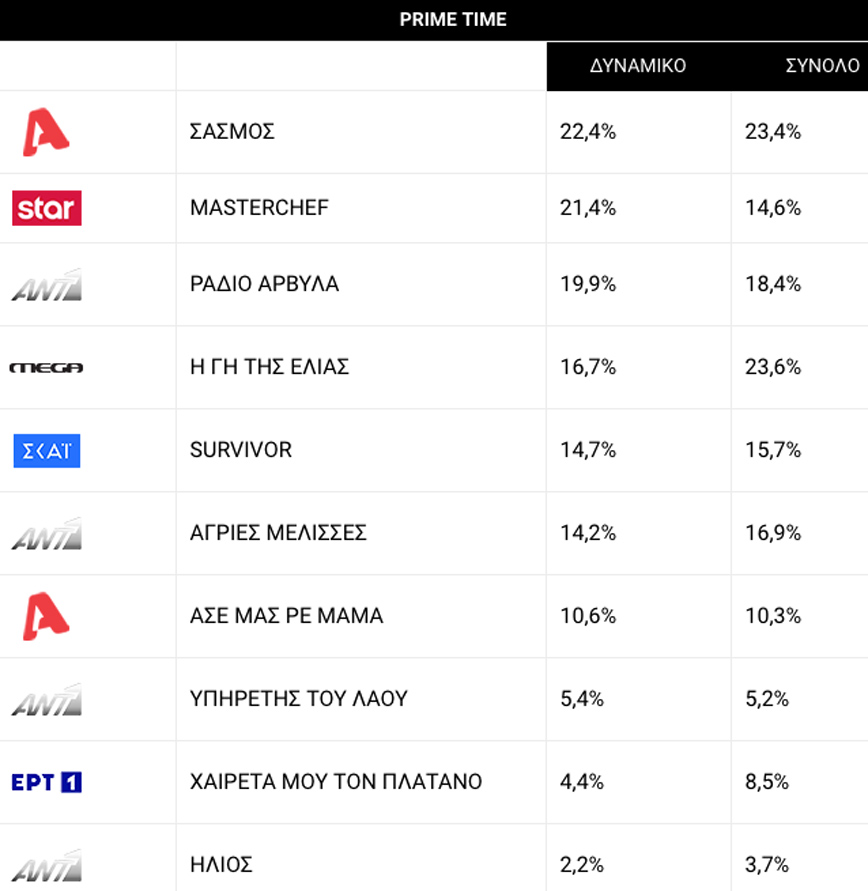 Στο γενικό σύνολο η Γη της Ελιάς σημείωσε μέσο όρο 23,6% και ακολούθησε σε απόσταση αναπνοής ο Σασμός με 23,4%. Οι Ράδιο Αρβύλα είχαν 18,4%, οι Άγριες Μέλισσες 16,9%, το Survivor 15,7% και το MasterChef 14,6%.