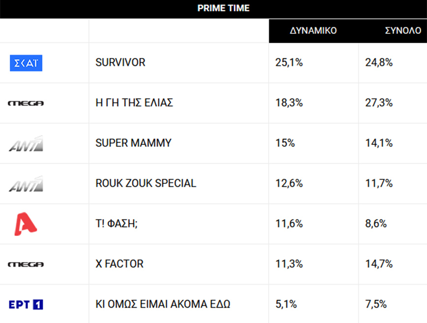 Όσον αφορά το δυναμικό κοινό, το Survivor έπιασε κορυφή με 25,1% και ακολούθησε η Γη της Ελιάς με 18,3%. Το Ρουκ Ζουκ βρέθηκε στο 12,6%, το «Τι Φάση» στο 11,6% και το X Factor 11,3%.