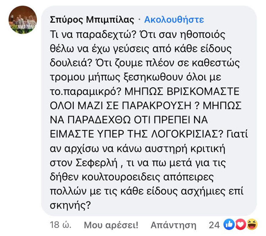 «Τι να παραδεχτώ; Ότι σαν ηθοποιός θέλω να έχω γεύσεις από κάθε είδους δουλειά? Ότι ζούμε πλέον σε καθεστώς τρόμου μήπως ξεσηκωθούν όλοι με το. παραμικρό; ΜΗΠΩΣ ΒΡΙΣΚΟΜΑΣΤΕ ΟΛΟΙ ΜΑΖΙ ΣΕ ΠΑΡΑΚΡΟΥΣΗ; ΜΗΠΩΣ ΝΑ ΠΑΡΑΔΕΧΘΩ ΟΤΙ ΠΡΕΠΕΙ ΝΑ ΕΙΜΑΣΤΕ ΥΠΕΡ ΤΗΣ ΛΟΓΟΚΡΙΣΙΑΣ; Γιατί αν αρχίσω να κάνω αυστηρή κριτική στον Σεφερλή, τι να πω μετά για τις δήθεν κουλτουροειδείς απόπειρες πολλών με τις κάθε είδους ασχήμιες επί σκηνής;» έγραψε απαντώντας στον διαδικτυακό του φίλο ο Σπύρος Μπιμπίλας.