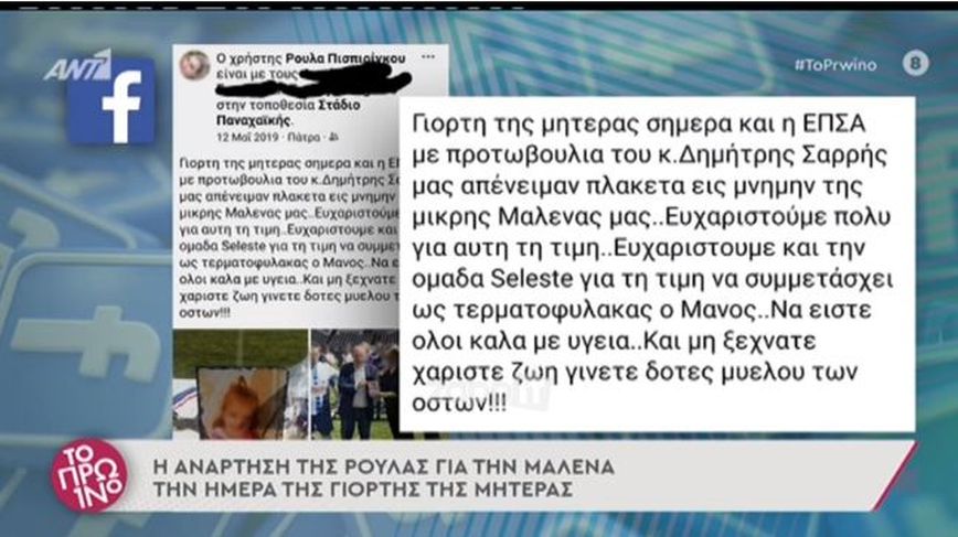 Τιμητική πλακέτα στη μνήμη της μικρής Μαλένας, 30 μόλις ημέρες μετά το θάνατο του παιδιού τους, έλαβαν οι γονείς, Μάνος Δασκαλάκης και Ρούλα Πισπιρίγκου. Το ζευγάρι φωτογραφάθηκε κατά τη διάρκεια της εκδήλωσης και είχε γίνει και ανάλογη ανάρτηση στα social media από την προφυλακισμένη μητέρα.