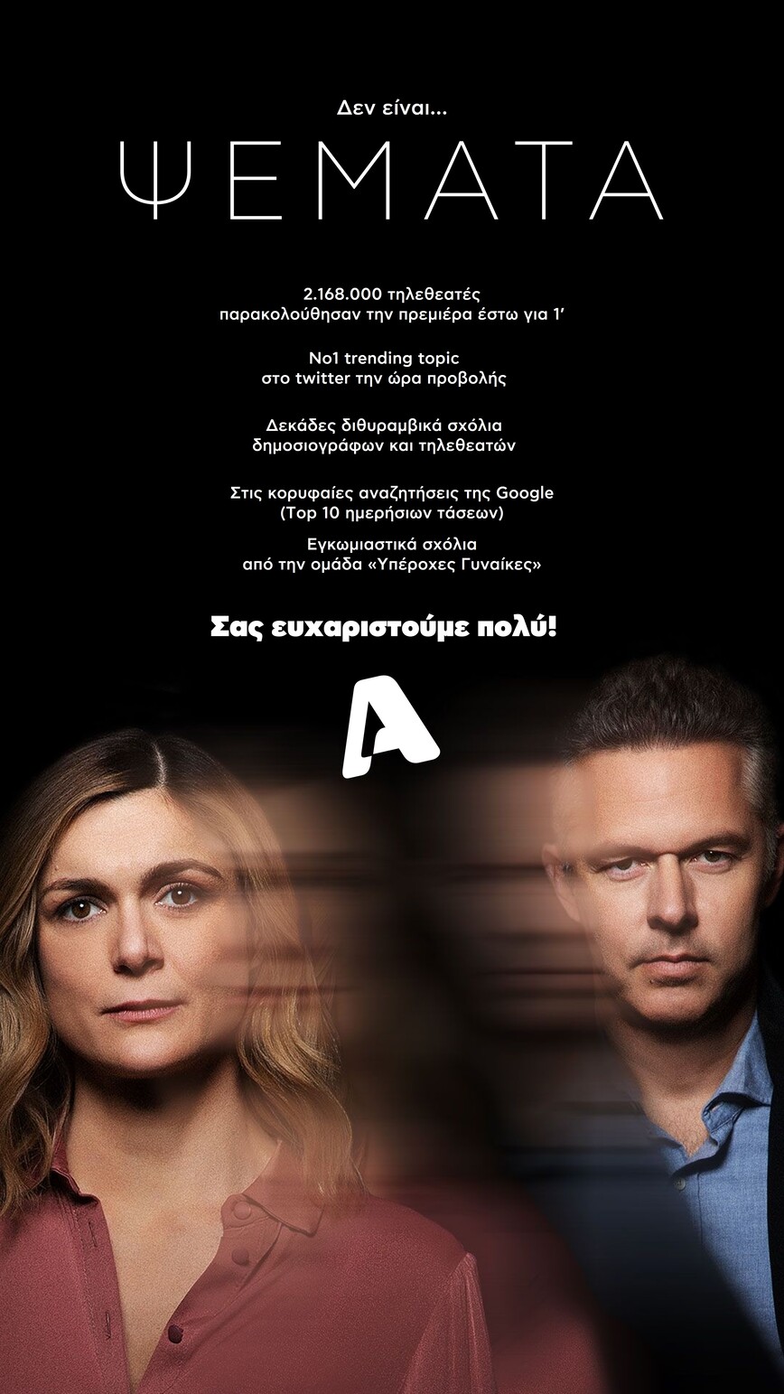 Κέρδισε τους τηλεθεατές από το πρώτο κιόλας επεισόδιό της η νέα σειρά του Alpha «Ψέματα». Το δυνατό κοινωνικό θέμα που διαπραγματεύεται και δεν είναι άλλο από τη βία κατά των γυναικών και οι εξαιρετικές ερμηνείες των πρωταγωνιστών συντόνισαν 2.168.000 τηλεθεατές έστω για ένα λεπτό στους δέκτες τους.