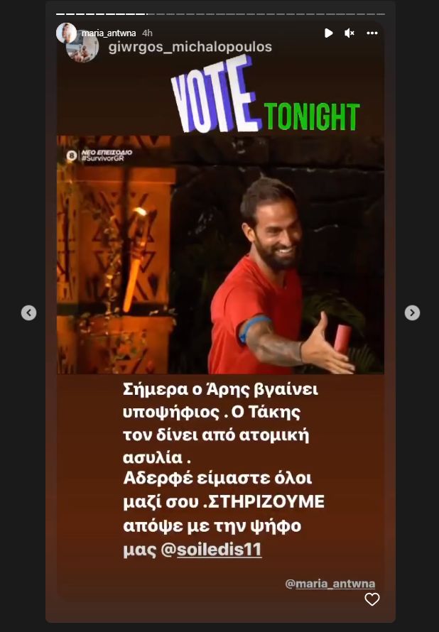 Όπως φαίνεται και στο Instastory που δημοσίευσε, ο Άρης Σοϊλέδης θα βγει στον τάκο από τον Τάκη Καραγκούνια ο οποίος θα αναδειχθεί νικητής της δεύτερης ατομικής ασυλίας.