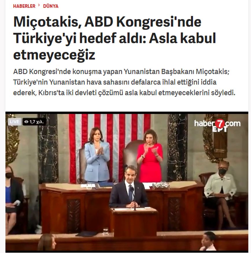 «Ο Μητσοτάκης έβαλε στο στόχαστρο την Τουρκία, μιλώντας στο Κογκρέσο των ΗΠΑ» είναι ο τίτλος δημοσιεύματος του haber7.com, στρέφοντας τα πυρά του κατά του Έλληνα πρωθυπουργού για όσα ανέφερε για τις προκλητικές ενέργειες της Τουρκίας σε Αιγαίο Πέλαγος και Ανατολική Μεσόγειο. Το δημοσίευμα υποστηρίζει πως ο Μητσοτάκης έστειλε «μήνυμα» στο Κογκρέσο για αποτροπή πώλησης F-16 στην Τουρκία.