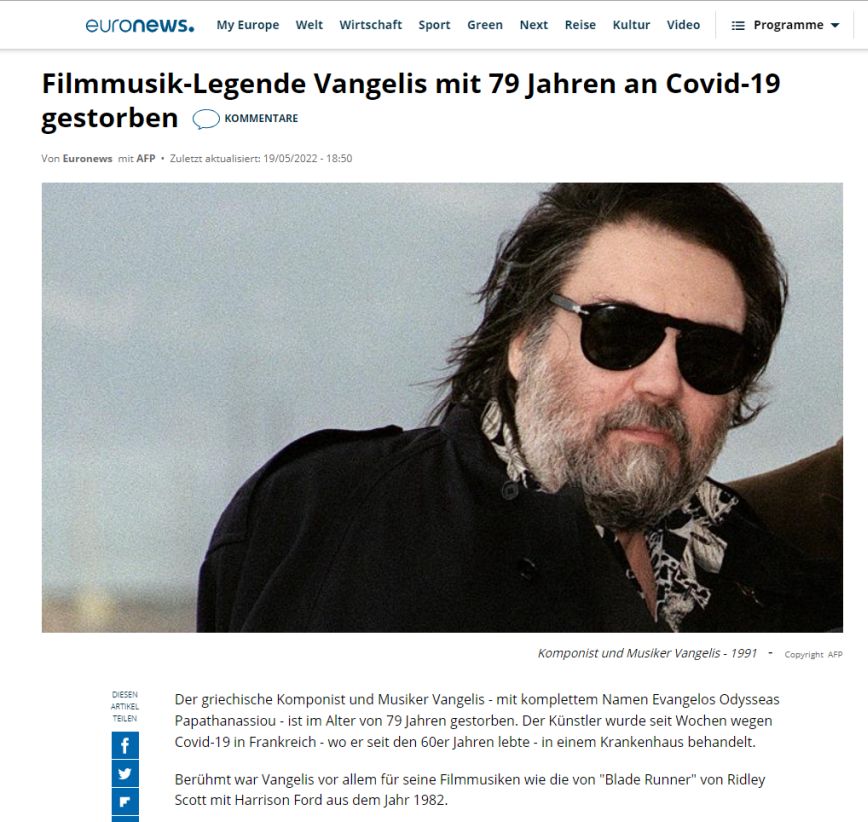 Η γερμανική έκδοση του Euronews υπογράμμισε πως ο Βαγγέλης Παπαθανασίου θεωρούνταν ένας από τους πρωτοπόρους της ηλεκτρονικής μουσικής.