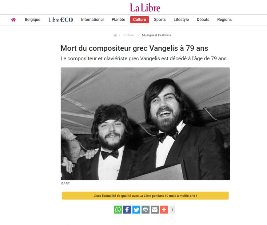 Και τα γαλλικά ΜΜΕ όπως το lalibre αποχαιρετούν τον Βαγγέλη Παπαθανασίου.