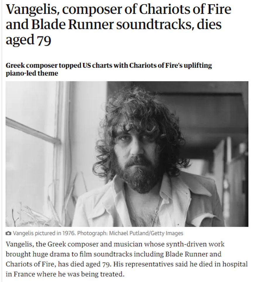 O Guardian αναφέρθηκε στο θάνατο του Βαγγέλη Παπαθανασίου ενώ ιδιαίτερη αναφορά έκανε στο Όσκαρ που πήρε ο μουσικοσυνθέτης για το τραγούδι της ταινίας «Οι δρόμοι της Φωτιάς».
