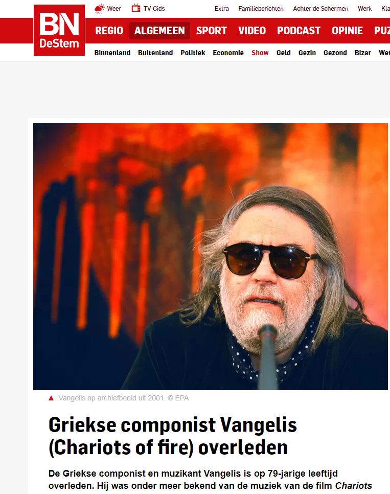 Το Ολλανδικό bndestem ανέφερε το θάνατο του Βαγγέλη Παπαθανασίου υπογραμμίζοντας και αυτό το Όσκαρ που είχε κερδίσει ο μουσικοσυνθέτης.